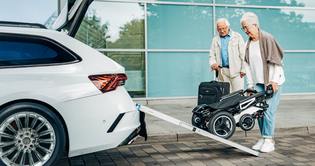 Dans le cas d’un fauteuil roulant électrique pliable ergoflix, il peut être accompagné sur des rampes télescopiques pour monter dans le coffre sans le soulever complètement. Même plié, le fauteuil peut être aidé par son moteur électrique lors du franchissement des rampes, ce qui réduit l’effort pour l’aidant.
